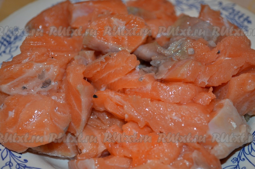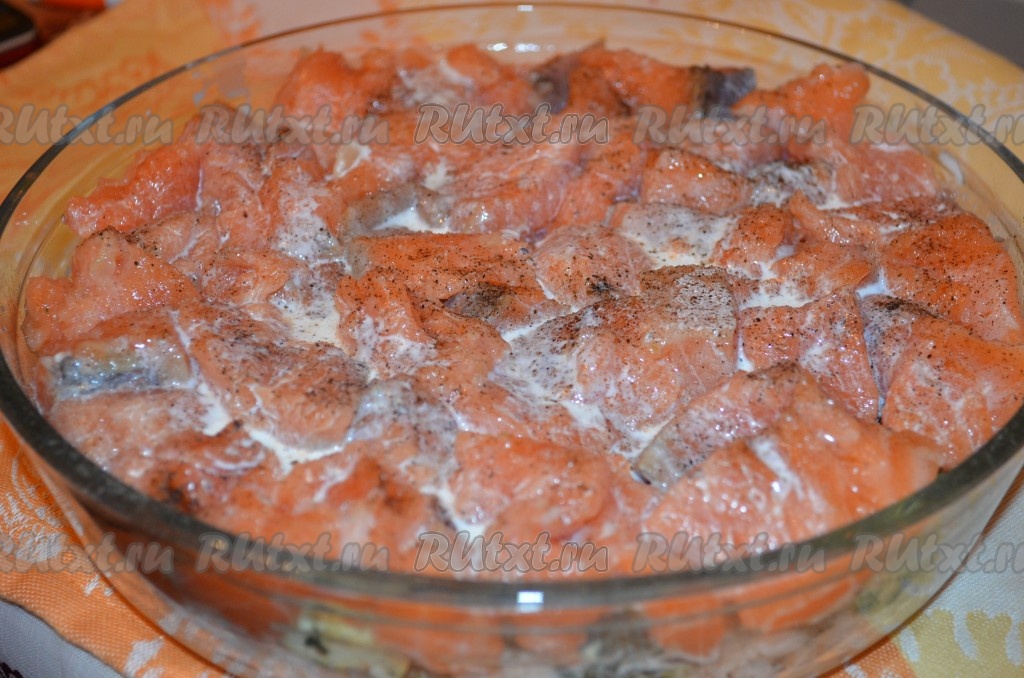 Следующий слой - рыба. Посолить, поперчить, сбрызнуть лимонным соком, полить оставшимися 100 мл сливок.