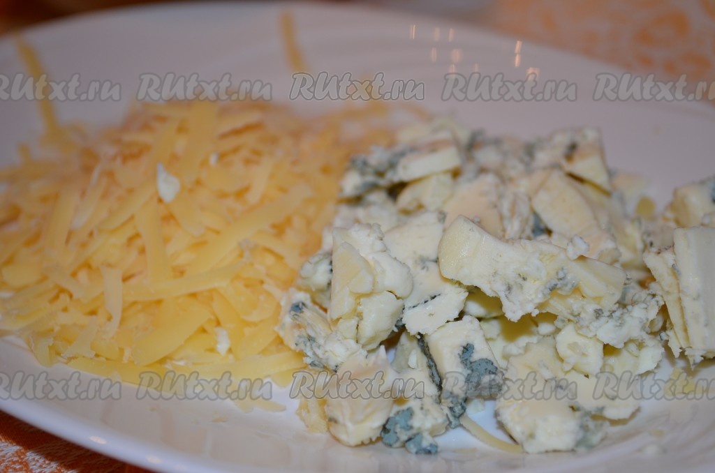 Твердый сыр и сыр дор-блю натереть на крупной терке.