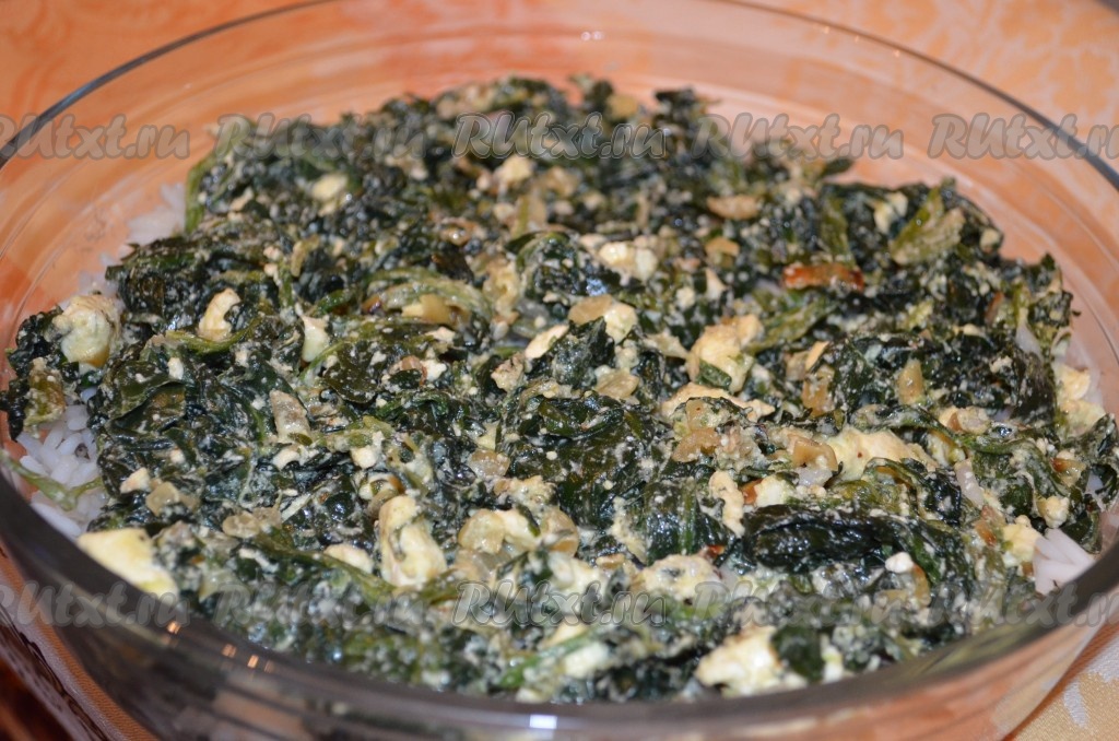 Поверх риса выкладываем шпинатно-сырную смесь.