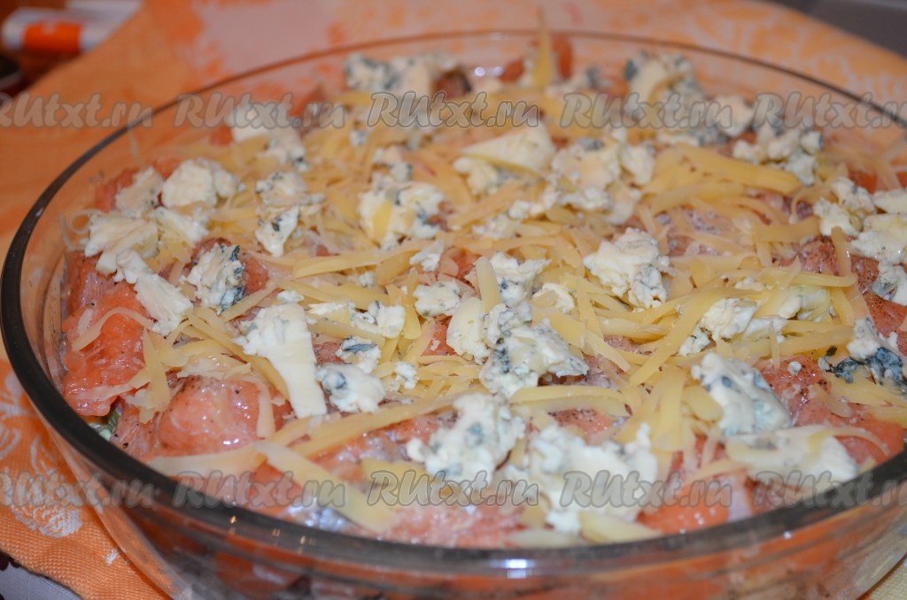 Посыпаем запеканку твердым сыром и сыром дор-блю.