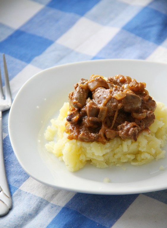 Когда куриная печень с луком будут готовы, влить получившийся яблочный соус, посолить, поперчить, перемешать.