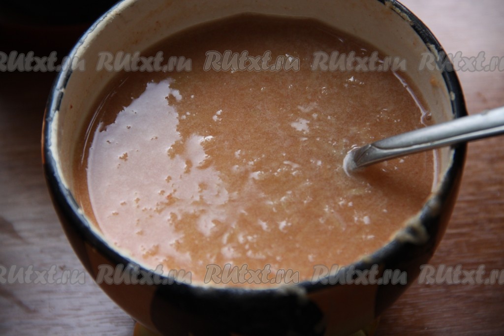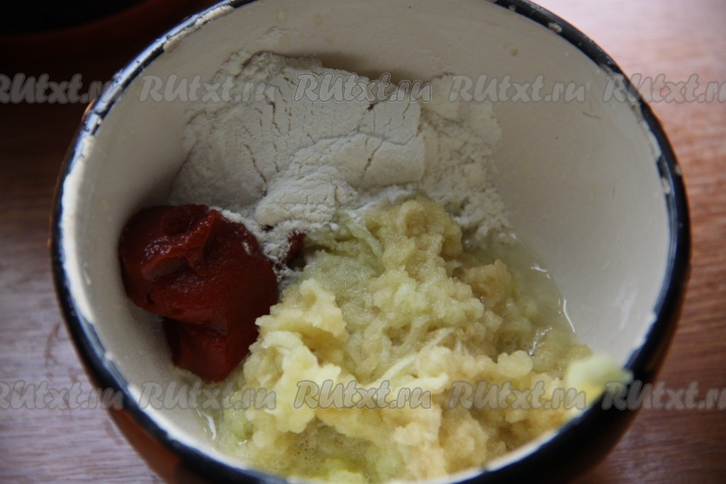 Для приготовления яблочного соуса в отдельной емкости смешать томатную пасту, муку и натертое на мелкой терке кислое яблоко.