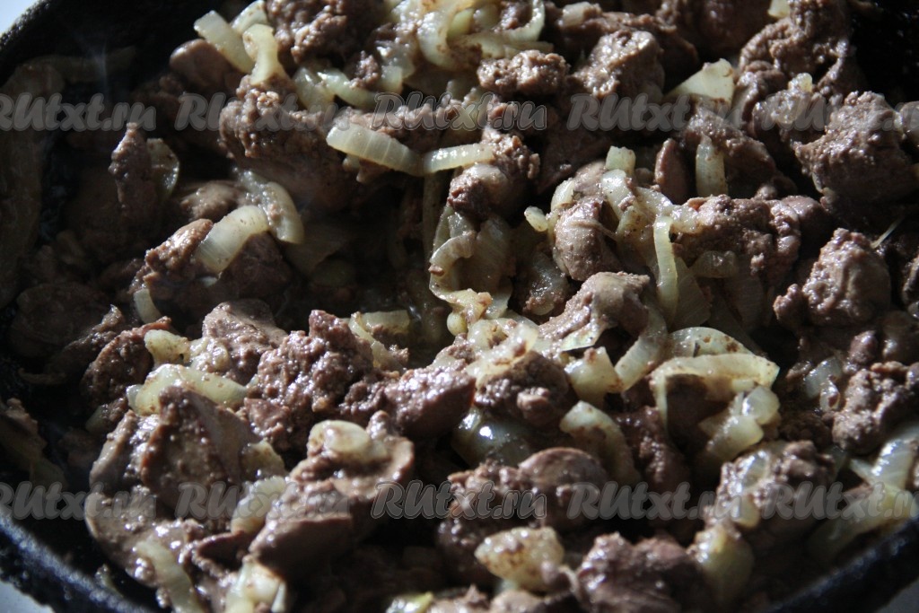 Жарить печень с луком на медленном огне, периодически помешивая, до мягкости лука и готовности печени. Печень считается готовой, если при прокалывании вилкой из неё выделяется прозрачный (без вкраплений крови) сок. Я обжаривала, примерно, 5 минут.