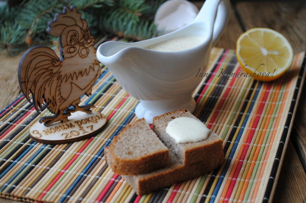 Не прекращая взбивать, тонкой струйкой влить растительное масло. Количество масла зависит от желаемой консистенции майонеза. Я готовила майонез в качестве соуса для рыбы, поэтому мне хватило 120 миллилитров масла, но если Вам нужен густой - добавляйте больше растительного масла. В самом конце приготовления добавить лимонный сок и ещё раз взбить майонез блендером.