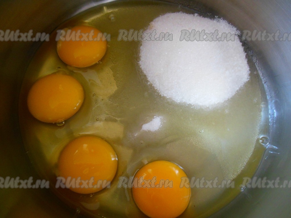 Сливочное масло достаньте из холодильника заранее, чтобы оно успело согреться и стать мягким. В ёмкость, удобную для взбивания миксером, разбейте яйца, всыпьте сахар и ванильный сахар.