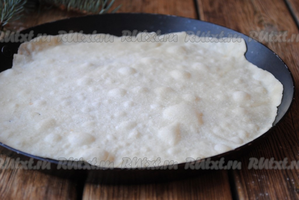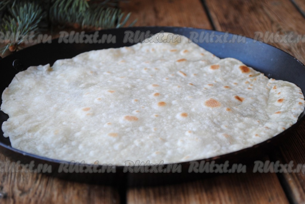 Стол присыпать мукой и каждую часть теста очень тонко раскатать в пласт круглой формы. Раскатанную лепёшку переложить на сухую, хорошо разогретую сковороду.