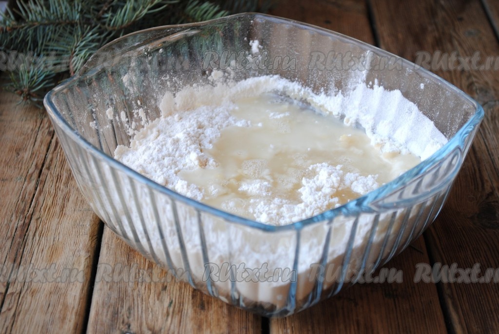 Влить горячую воду и быстро перемешать ложкой до увлажнения муки.