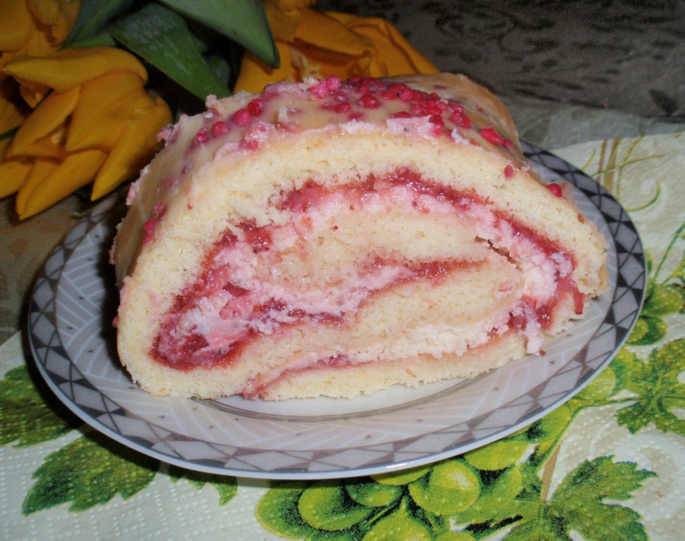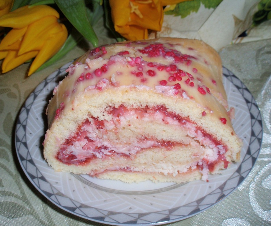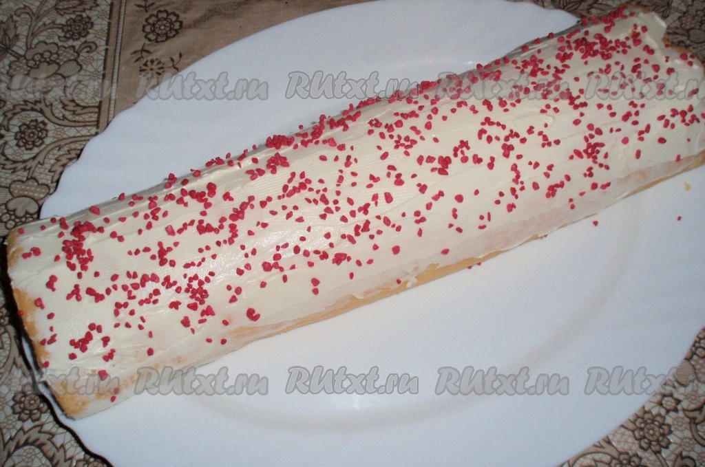 Переложить рулет на блюдо. Сверху смазать оставшимся кремом. Украсить по своему усмотрению. Я использовала для украшения кондитерскую посыпку со вкусом клубники.