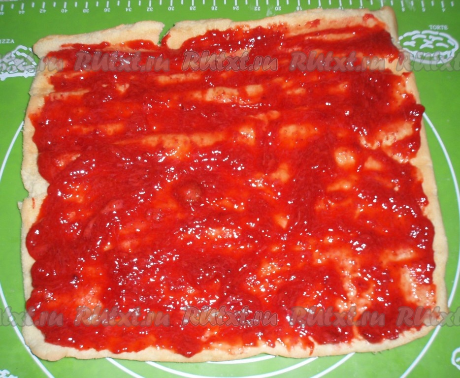 Остывший рулет развернуть, смазать остывшим клубничным пюре.