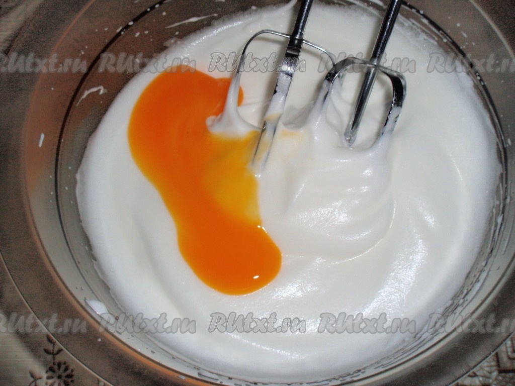 Яйца разделить на белки и желтки. Белки взбить до устойчивой пены, постепенно всыпая 50 грамм сахара. Затем добавить по 1 желтку, продолжая взбивать.