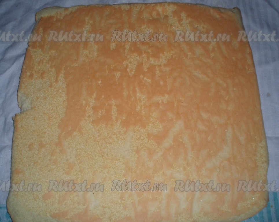 Готовое тесто вместе с бумагой перевернуть на чистое полотенце, быстро снять бумагу, а полотенце с тестом свернуть в рулет. Остудить.
