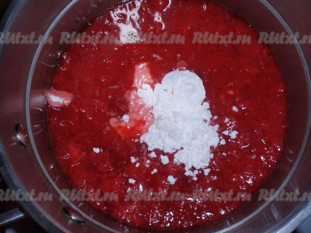 Тем временем подготовить начинку. Клубнику размять в пюре, добавить оставшиеся 50 грамм сахара. Я использовала уже готовое замороженное клубничное пюре с сахаром. В пюре добавить крахмал, тщательно размешать, поставить на небольшой огонь и, помешивая, довести смесь до кипения (до загустения). Остудить.