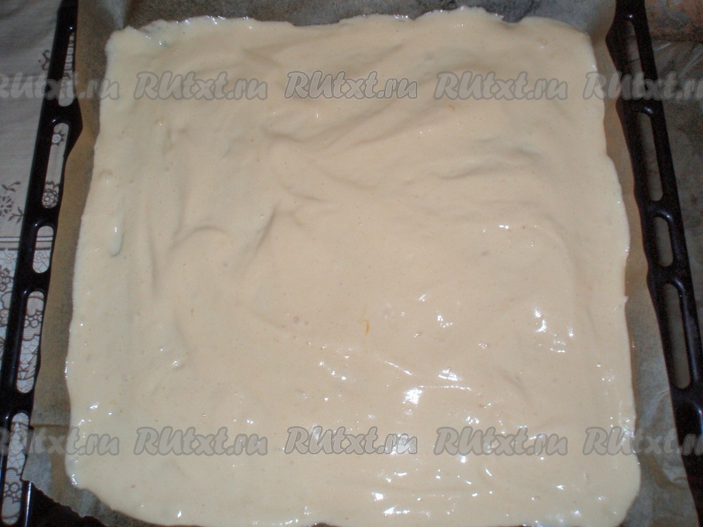 Духовку нагреть до 170 градусов. Противень застелить бумагой для выпечки. Подготовленное тесто размазать тонким слоем на бумаге для выпечки. Запекать тесто в духовке, примерно, 12-15 минут.