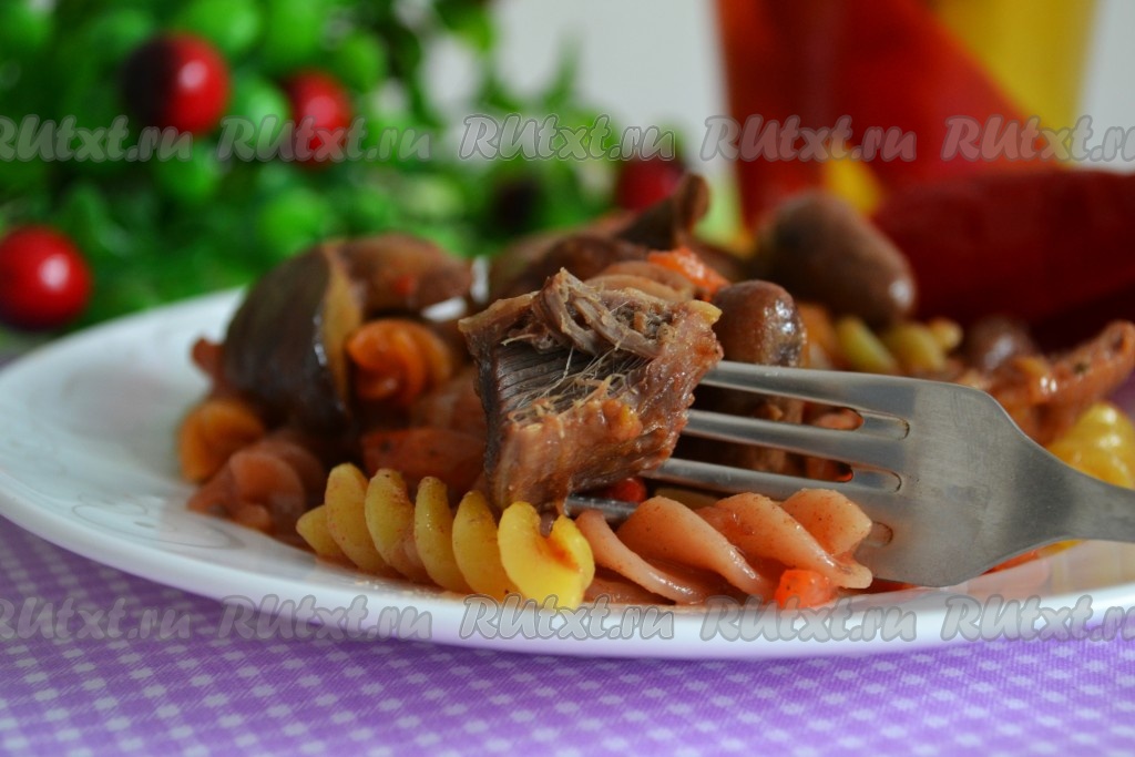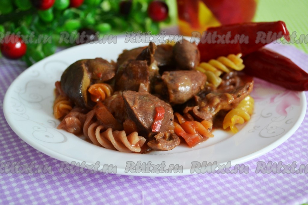 Очень вкусные куриные потроха, приготовленные в мультиварке, можно подать с отваренными макаронами.
