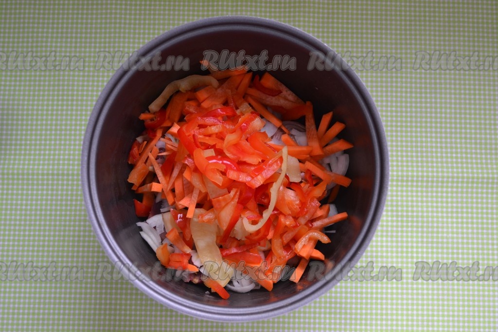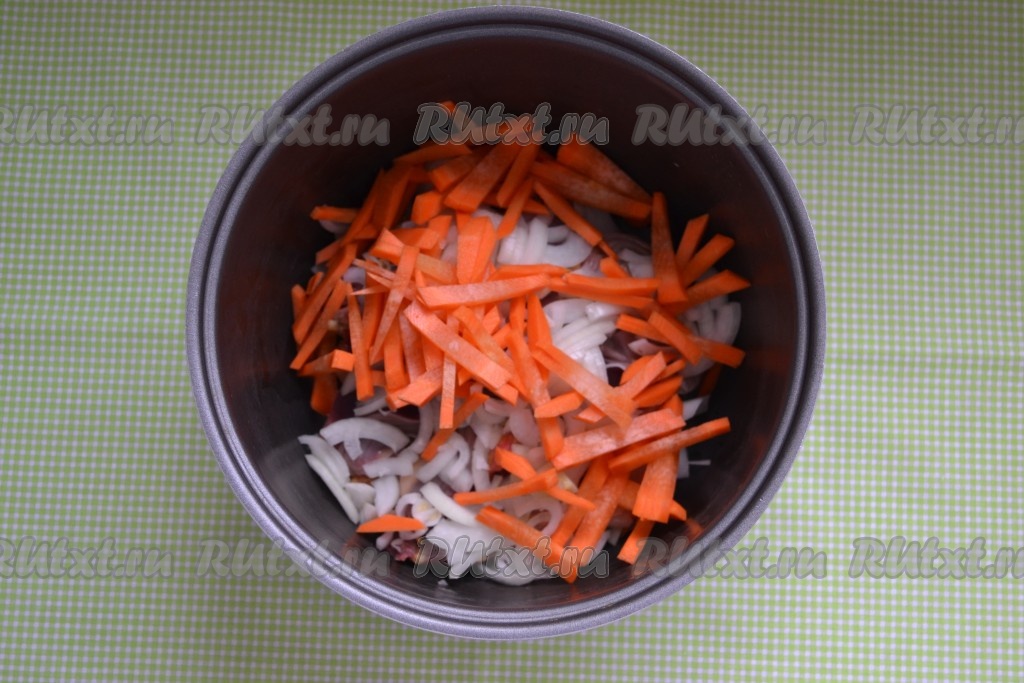 Очищенную морковь нарезать соломкой или натереть на крупной терке и выложить в чашу мультиварки.