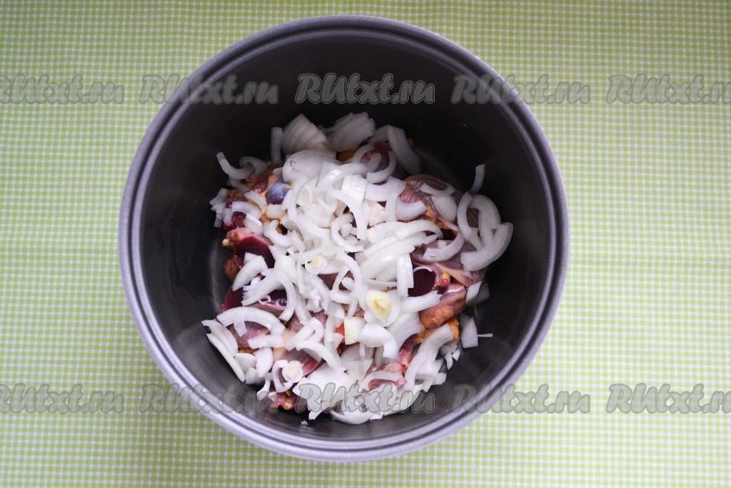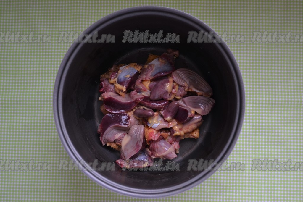 Куриные желудки и сердца хорошо вымыть, несколько раз меняя воду. Желудки разрезать на 2-3 части. Сложить в чашу мультиварки.