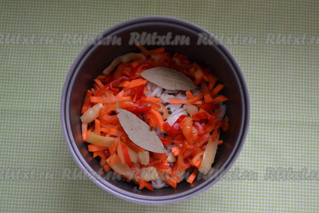По вкусу всыпать соль, сахар и молотый душистый перец. Включить мультиварку на функцию "Тушение" на 30 минут.