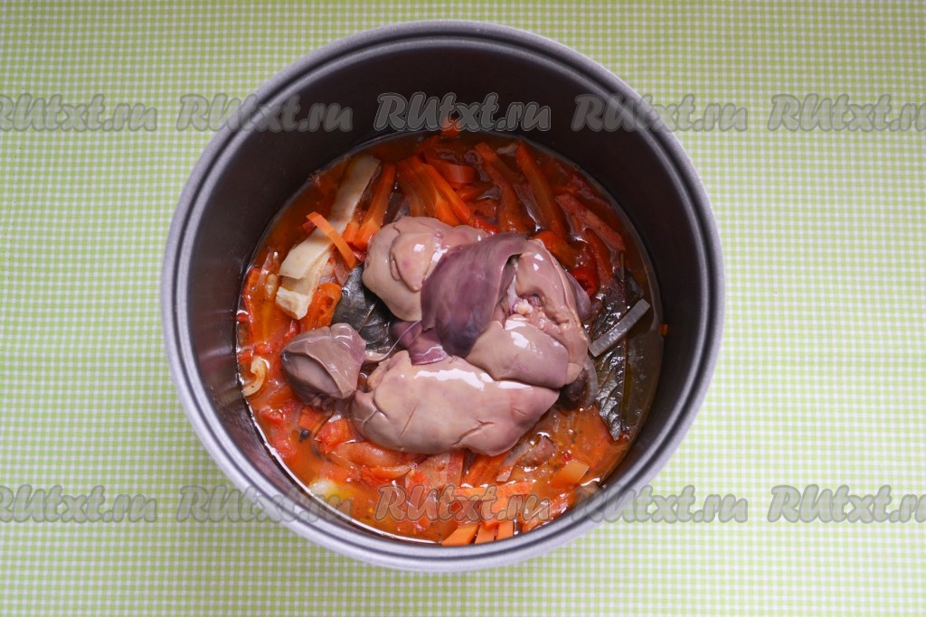 Когда мультиварка оповестит о завершении своей работы, выложить в нее вымытую куриную печень (печенку можно не нарезать на кусочки). И снова включить функцию "Тушение" на 15 минут. За отведенное время куриная печень успеет приготовиться и станет очень нежной, мягкой и вкусной.