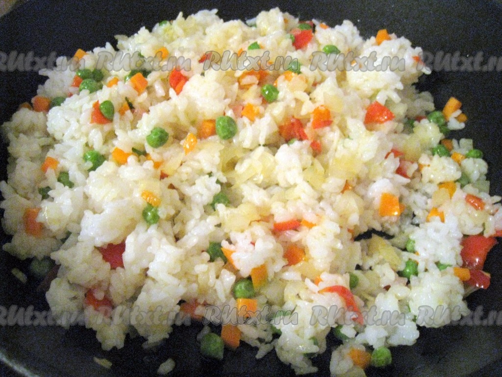 Рис перемешать с овощами на сковороде и оставить на слабом огне под крышкой.