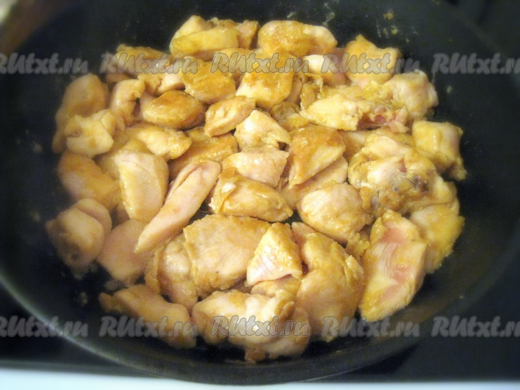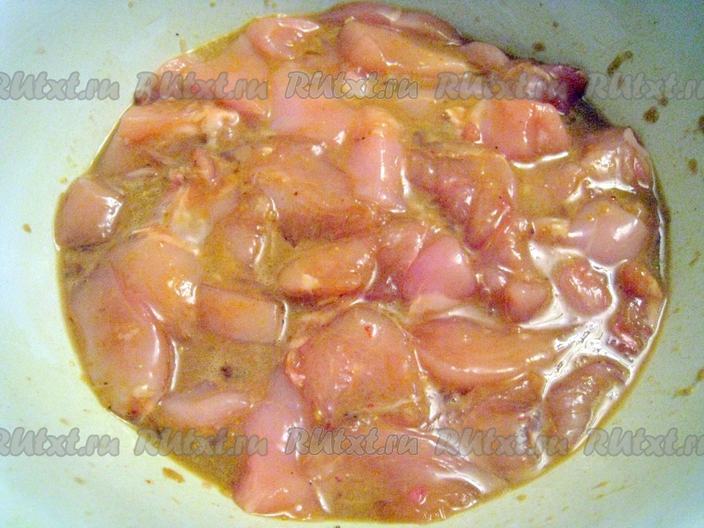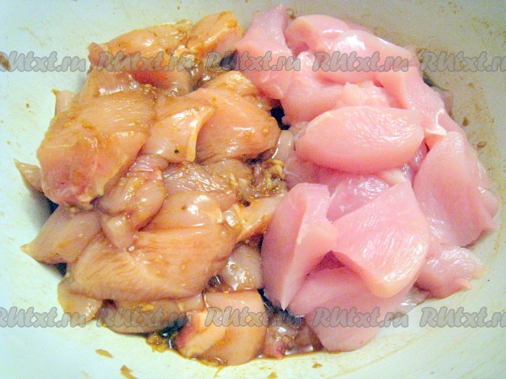 Куриные грудки нарезать на кусочки и поместить их на 15 минут в маринад.