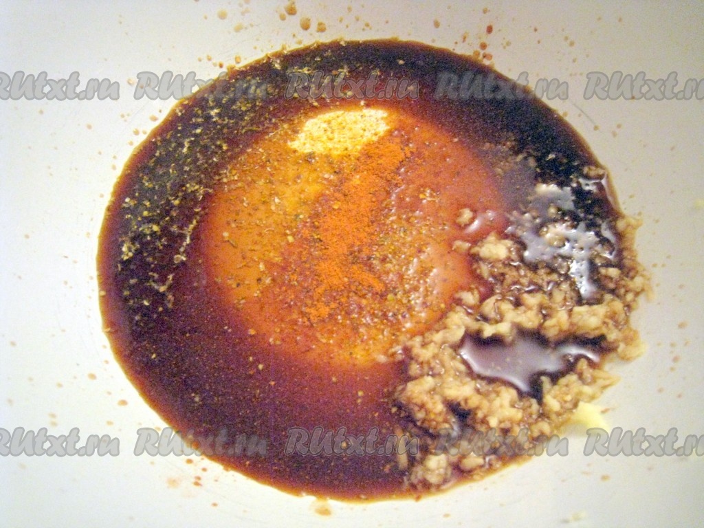 Для маринада к курице соединить соевый соус, тёртый имбирь, карри и паприку.