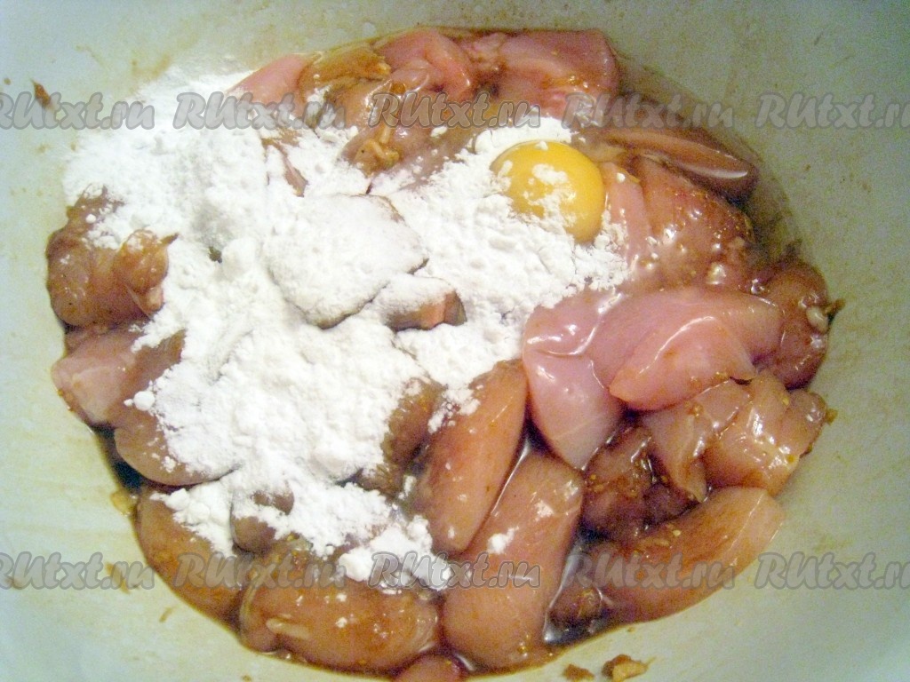Куриные кусочки немного замариновались за 15 минут и теперь добавим яйца (в идеале только белки... но можно и целые яйца) и крахмал, всё равномерно перемешать.