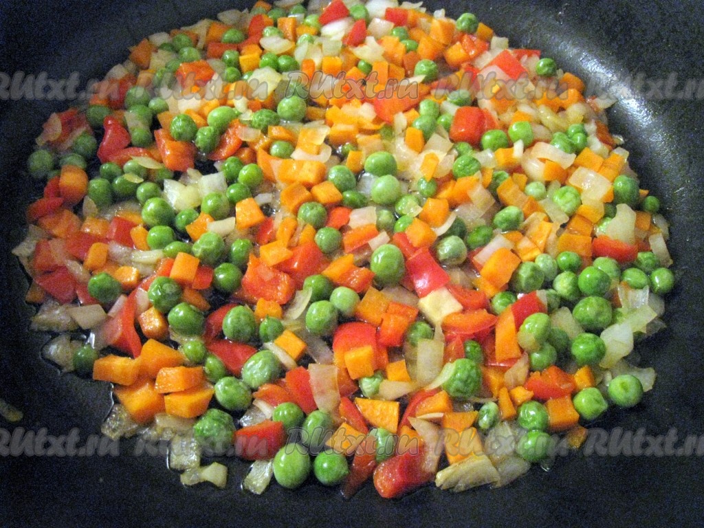 Пока кусочки куриных грудок маринуются, можно начать готовить овощи. Морковь, перец и лук порезать на кусочки и вместе с горошком положить на сковороду с растительным маслом, посолить, но каждый овощ сначала пусть обжаривается на своём участке сковороды.