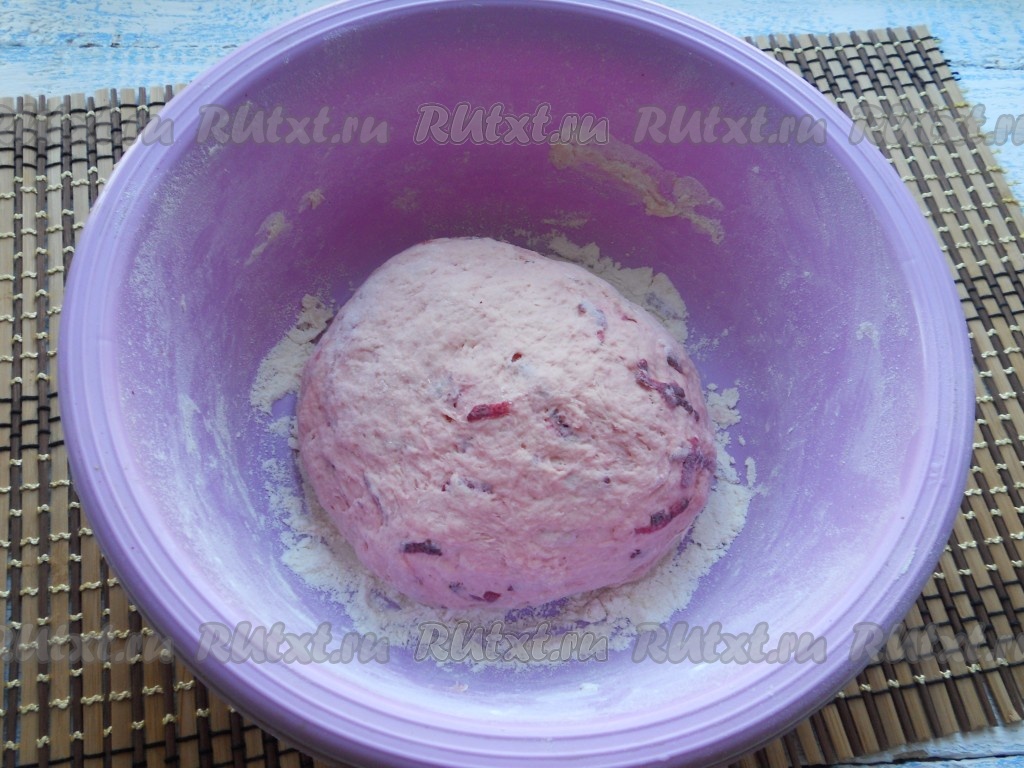 Подливая в получившуюся смесь воду, замесить тесто. Долго тесто месить не нужно, оно должно получиться немного липким. Миску с тестом, накрыв пищевой пленкой, оставить на 1 час в теплом месте.
