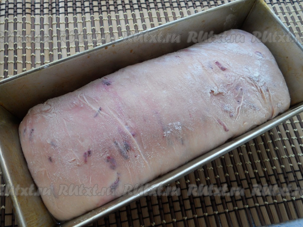 Подошедшее тесто выложить в смазанную растительным маслом форму для выпечки, накрыть пленкой и оставить еще минут на 40.