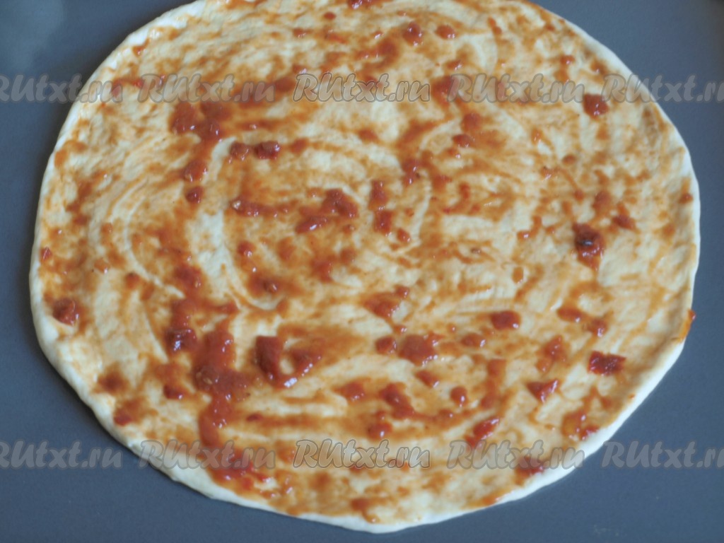 Разделить готовое тесто на две одинаковых части. Одну часть убрать в пакет, чтобы тесто не заветривалось. Можно тесто убрать в холодильник, пару дней оно может полежать там. Если не собираетесь сразу готовить 2 пиццы, то можно убрать тесто в морозилку и воспользоваться им в другое время. Противень смазать растительным маслом. Из оставшейся части теста раскатать на противне достаточно тонкую круглую лепёшку. Тесто прекрасно формируется руками. Затем лепёшку нужно смазать оливковым маслом, а сверху - томатным соусом.