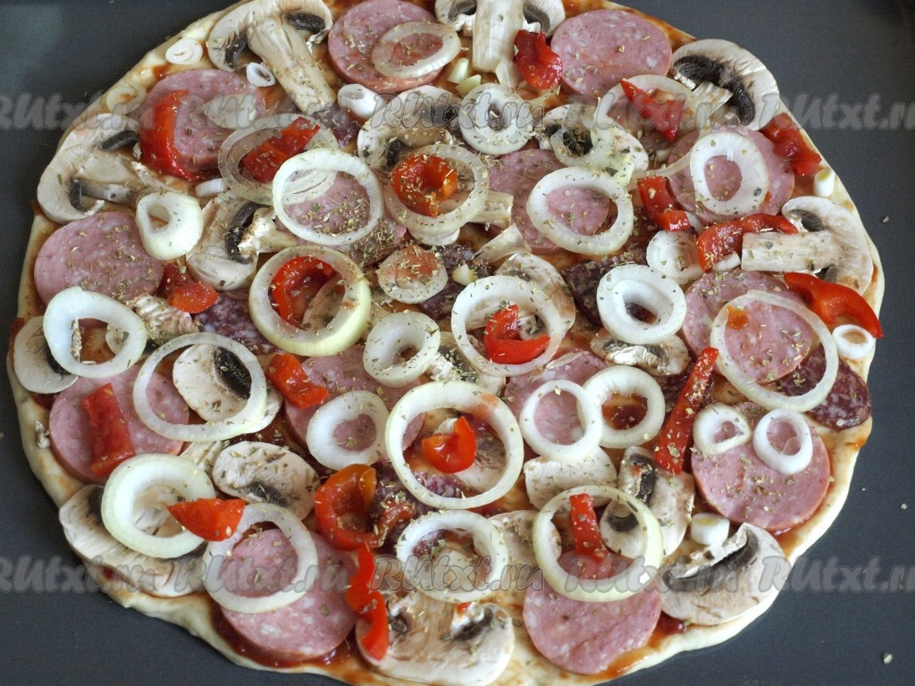 Кружочками нарезать лук, разложить его сверху колбасы с грибами, посыпать пиццу сухим орегано. Я ещё добавила консервированный перец, можно также взять помидоры.