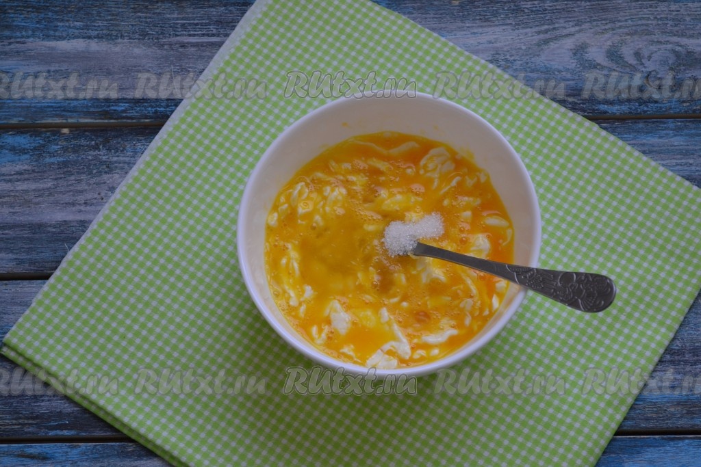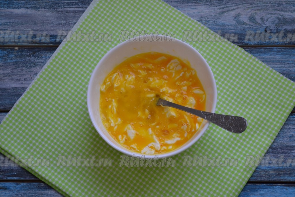 Перемешать яично-масляную массу с помощью вилки или венчика до однородности.