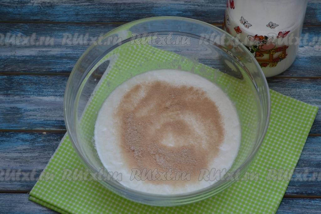 В теплый кефир всыпать дрожжи и 1 столовую ложку сахара.