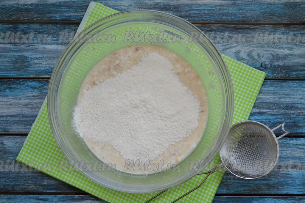 Затем частями всыпать просеянную муку, замешивая тесто.