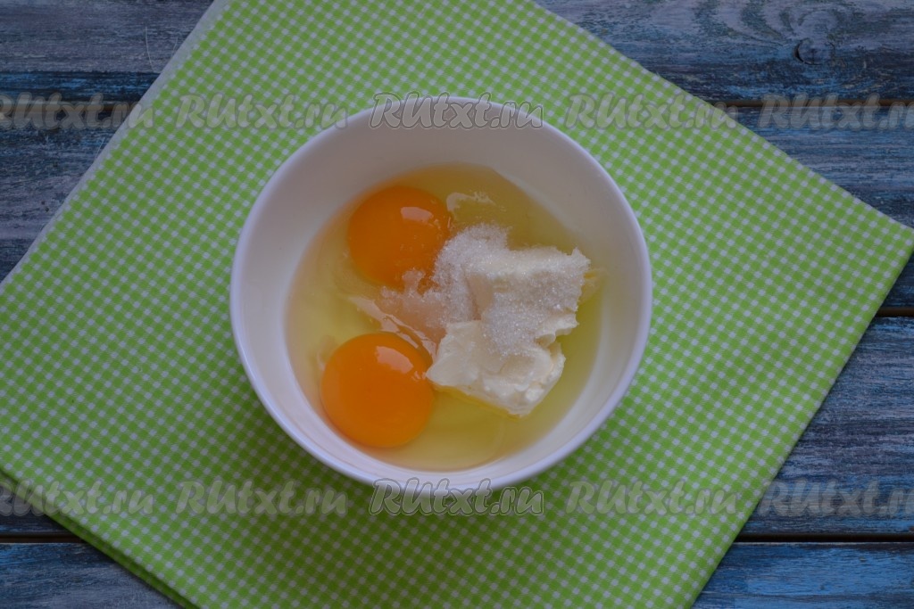 В это время приготовить масляно-яичную массу. В отдельной миске соединить мягкое сливочное масло, 2 яйца, щепотку соли и оставшийся сахар.
