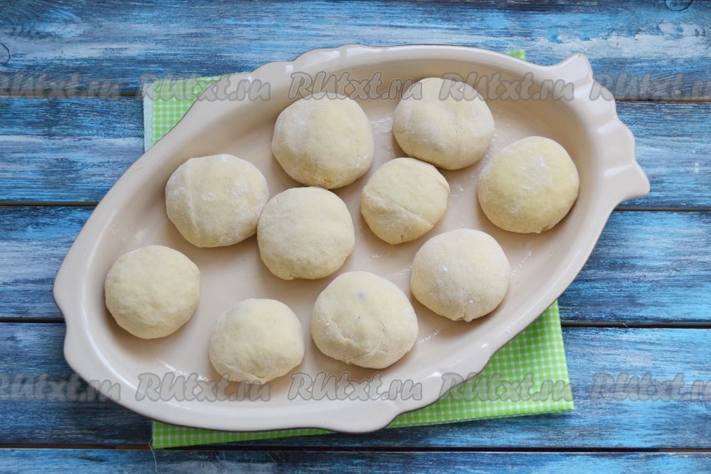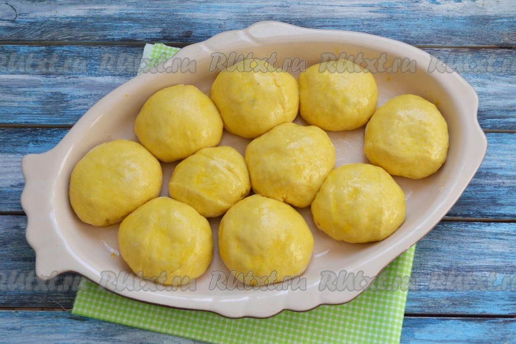 Выложить в форму все заготовки булочек швом вниз и оставить на 15-20 минут для расстойки (за это время булочки увеличатся в объёме).