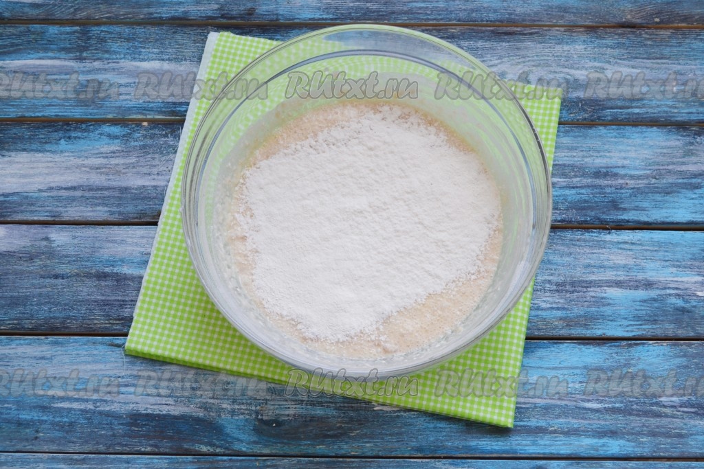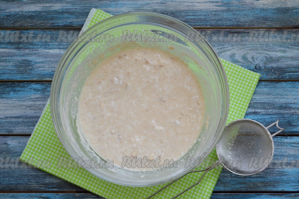 Перемешать всю массу, накрыть салфеткой и оставить в теплом месте на 15-20 минут для созревания дрожжевой опары (дрожжи должны за это время "ожить").