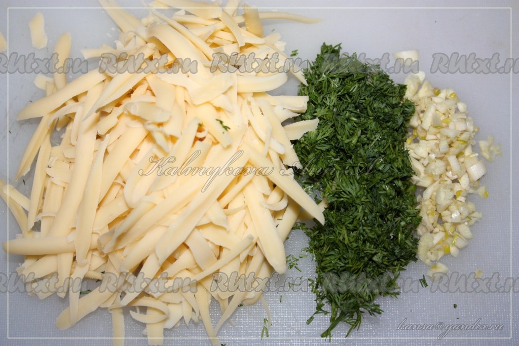 Филе курицы нарезать крупными кусочками. Натереть сыр, измельчить чеснок и зелень.