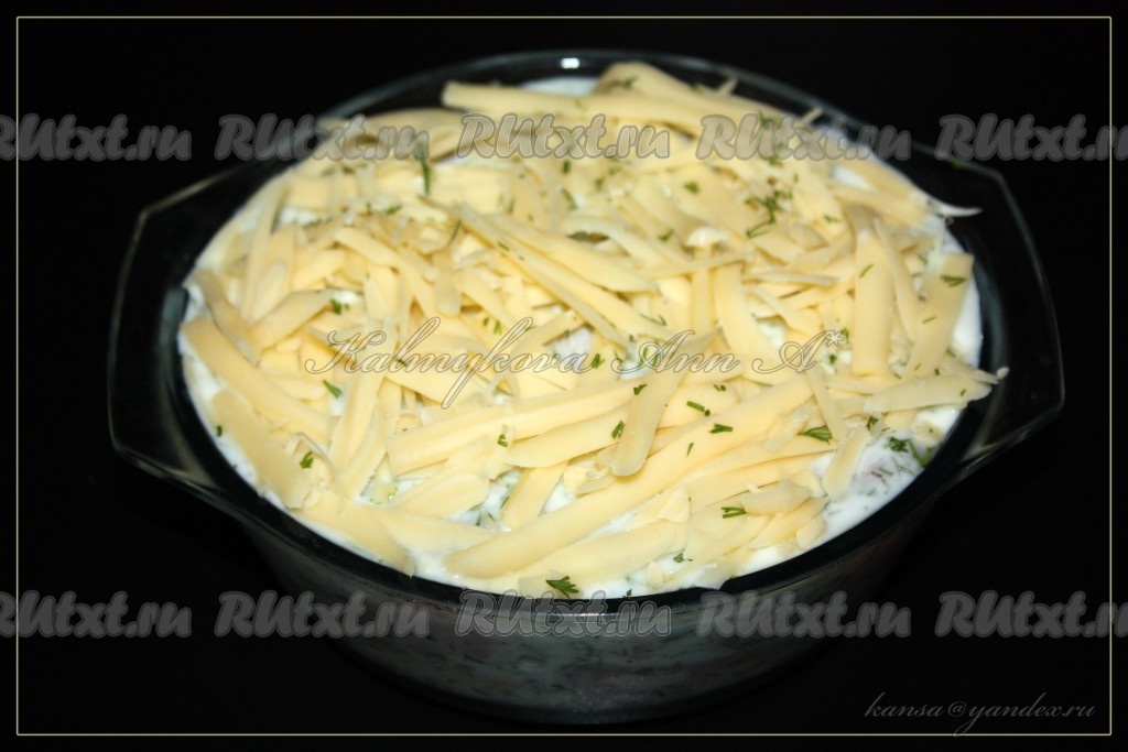 Положить в огнеупорную форму для выпечки, сверху посыпать оставшимся натертым сыром. Запекать в разогретой духовке 30 минут при температуре 200 градусов, а затем 10 минут на гриле для красивой корочки.