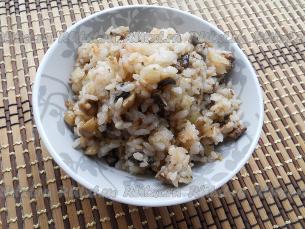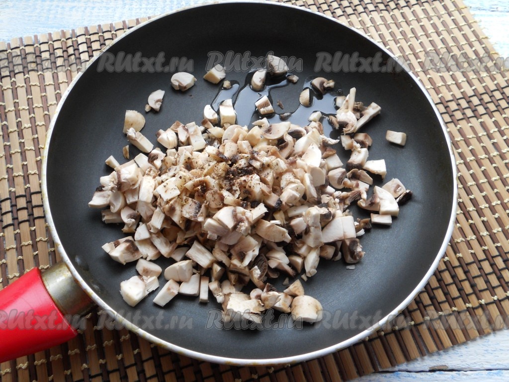 Рис предварительно отварить до готовности, согласно инструкции на упаковке. Если у вас обычный рассыпной рис, залейте его водой (в соотношении риса и воды 1:2), доведите до кипения, подсолите и варите минут 15-20 на небольшом огне, после чего промойте горячей водой. Шампиньоны нарезать небольшими кусочками, поместить в сковороду с растительным маслом. Немного посолить и поперчить.