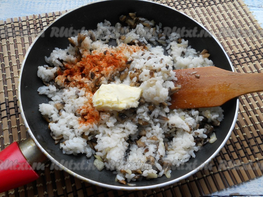 Обжаривать еще около 4-5 минут. Далее добавить в сковороду рис, сливочное масло и паприку.