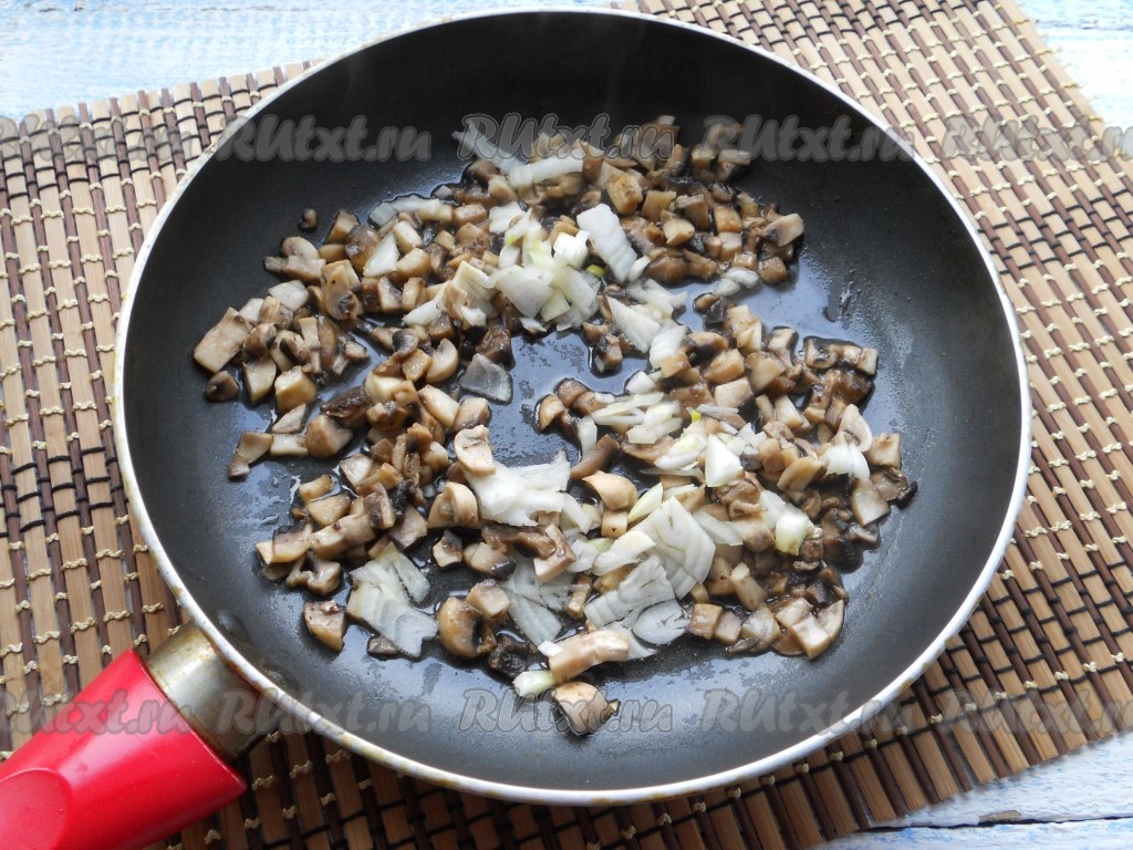 Обжарить грибы на небольшом огне, помешивая, в течение 4-5 минут, после чего добавить мелко нарезанный репчатый лук.
