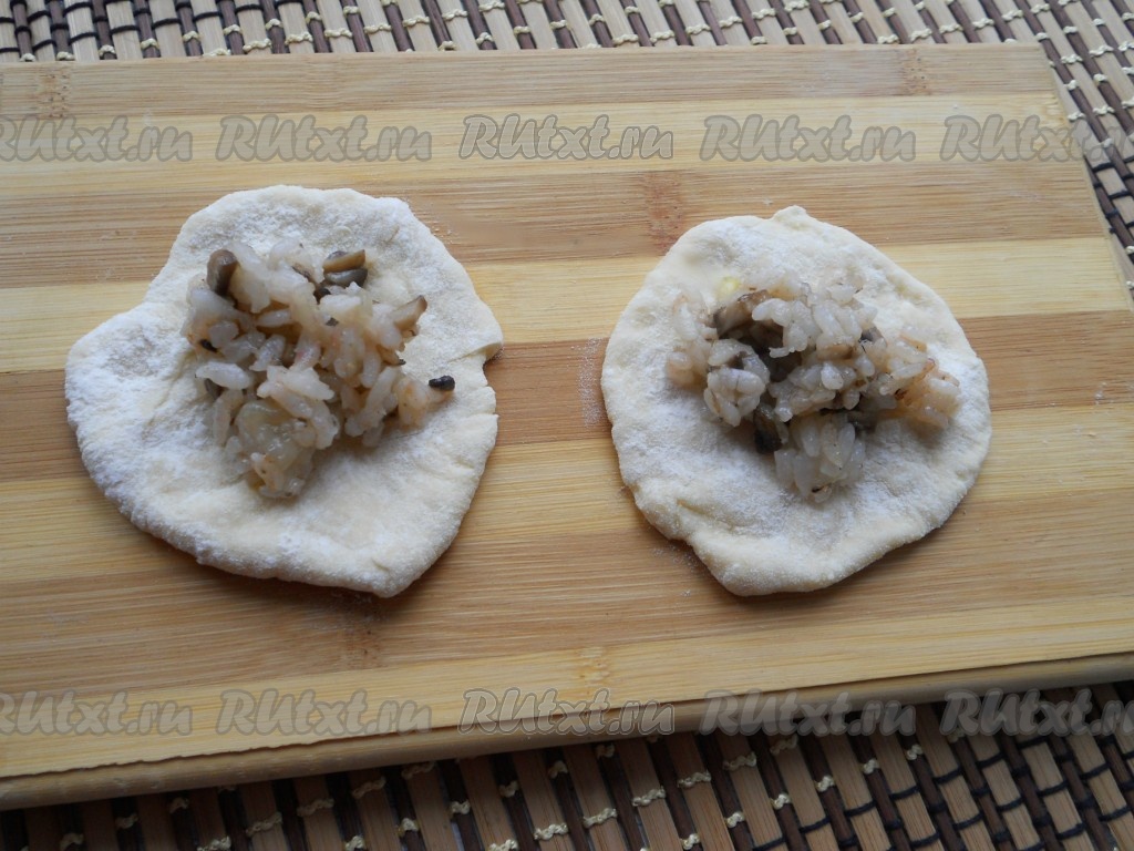 Это тесто не требует подхода и расстойки, поэтому пирожки можно лепить сразу. Для этого тесто разделить на небольшие части, каждую - раскатать в лепешку. Поместить на лепешку ложку начинки из риса и грибов. Пирожки лучше делать не слишком большие.
