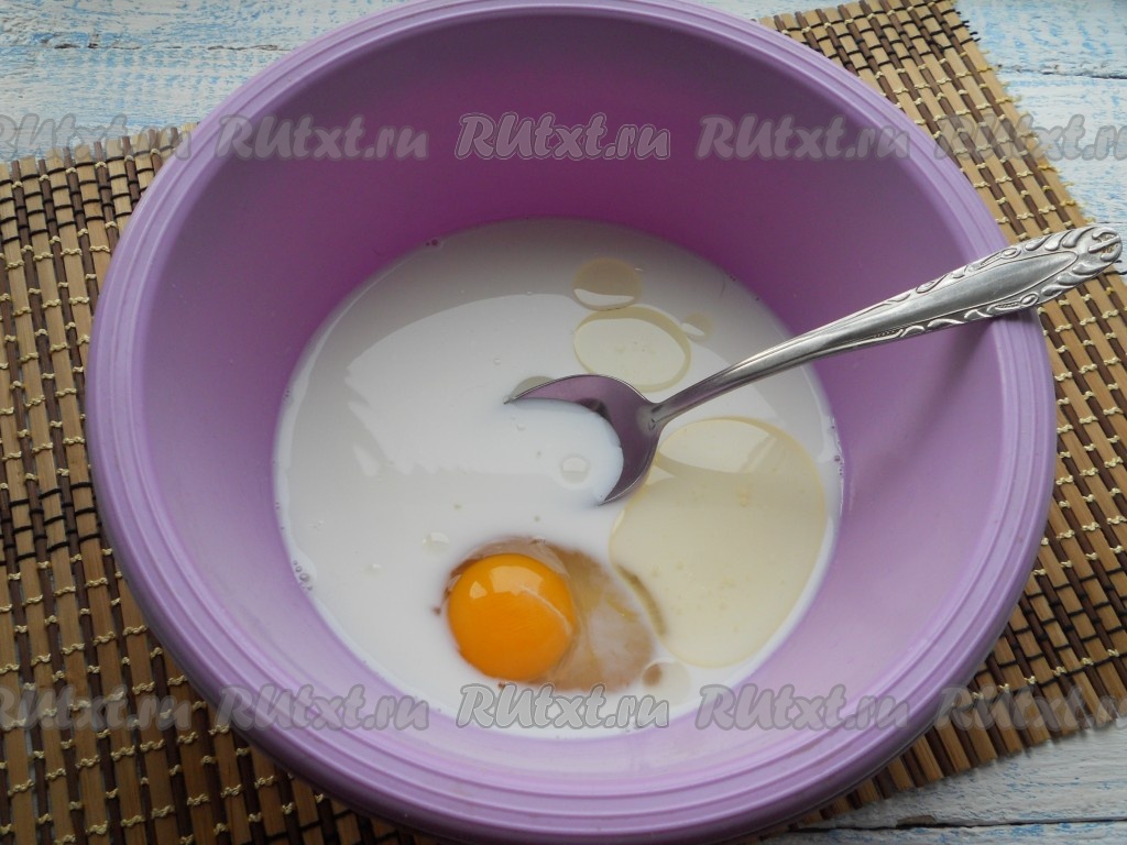 Пока начинка остывает, замесите тесто. Для этого молоко комнатной температуры смешать с теплой водой, добавить соль, сахар, сырое яйцо, растительное масло, перемешать.