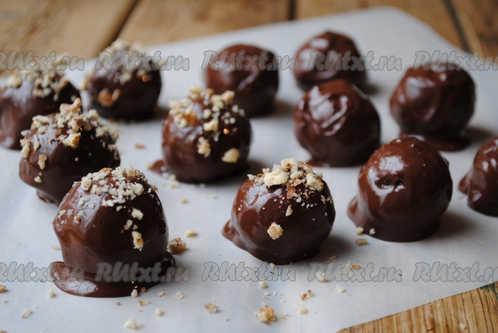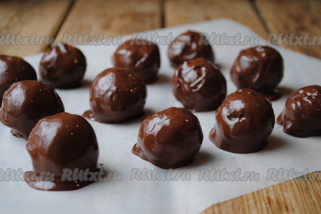 Затем каждую конфетную заготовку обвалять в жидком шоколаде. Выложить на пергамент.