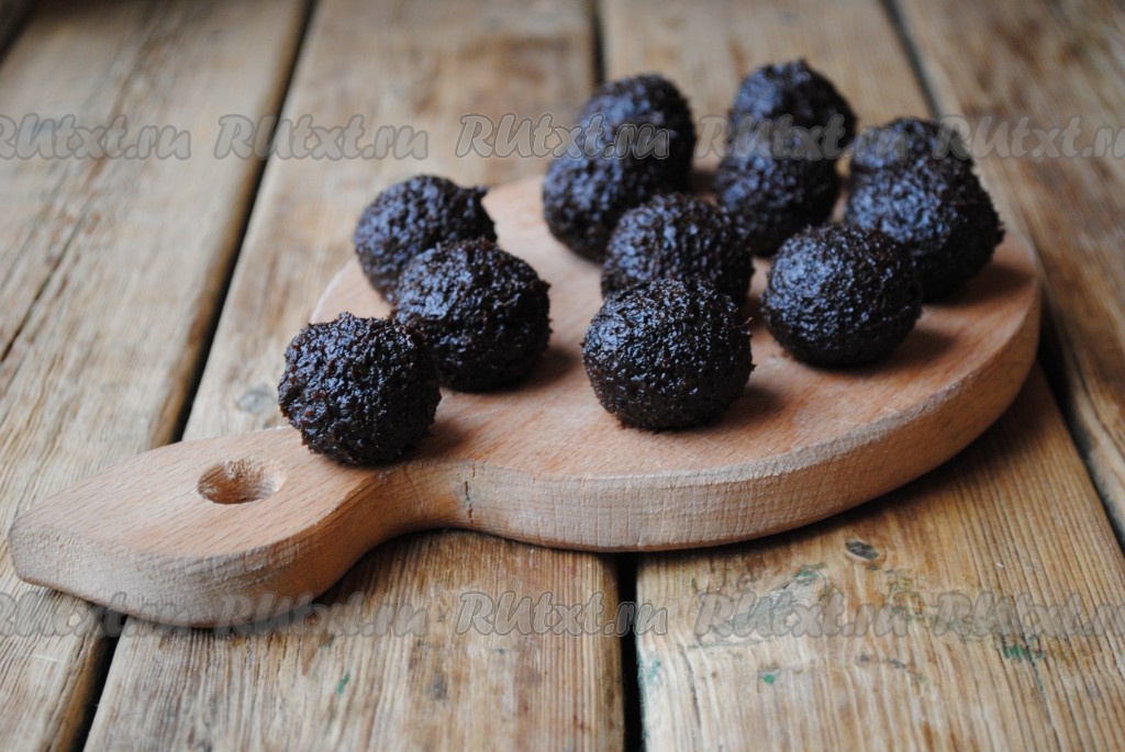 Из измельчённого чернослива скатать шарики небольших размеров (у меня вышло 12 штук).