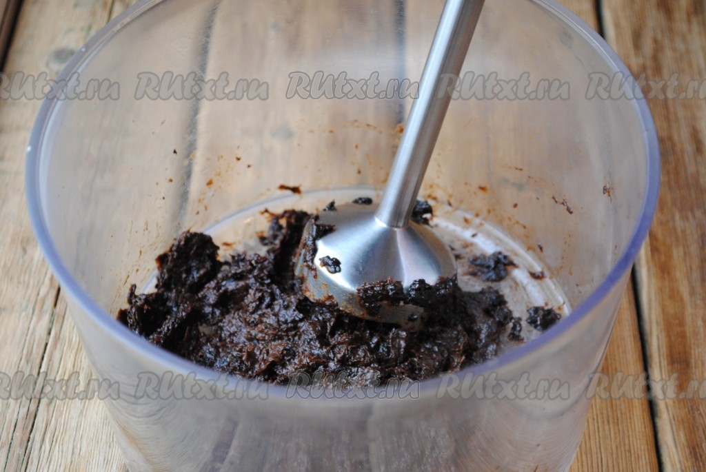 Чернослив промыть под проточной водой, обсушить. Если у вас сухофрукты очень сухие и жёсткие, их можно замочить в горячей воде на 5-10 минут. Подготовленный чернослив взбить блендером до однородной, кашеобразной массы (можно пропустить через мясорубку).