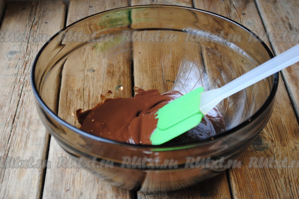 Растопить шоколад до жидкого состояния на водяной бане. Можно растопить шоколад и в микроволновке на режиме "Разморозка", выставив время, 10-20 секунд, затем миску достать, а шоколадную массу перемешать, снова отправить в микроволновку и повторить эту процедуру до полного растапливания шоколада.