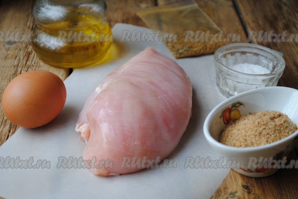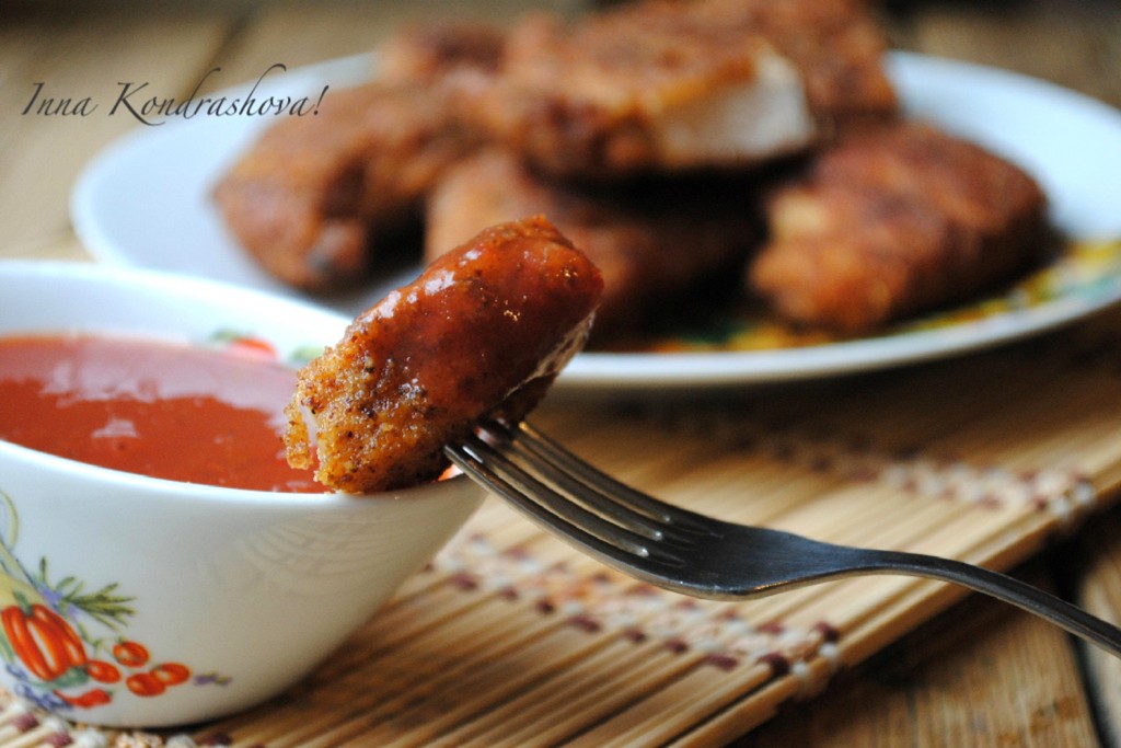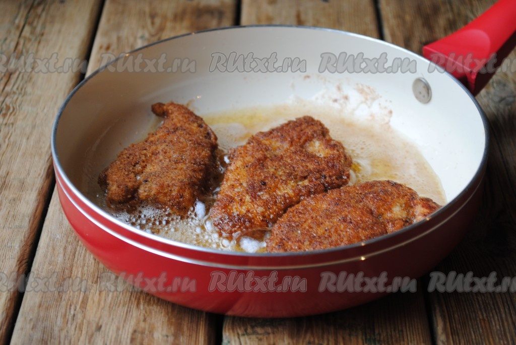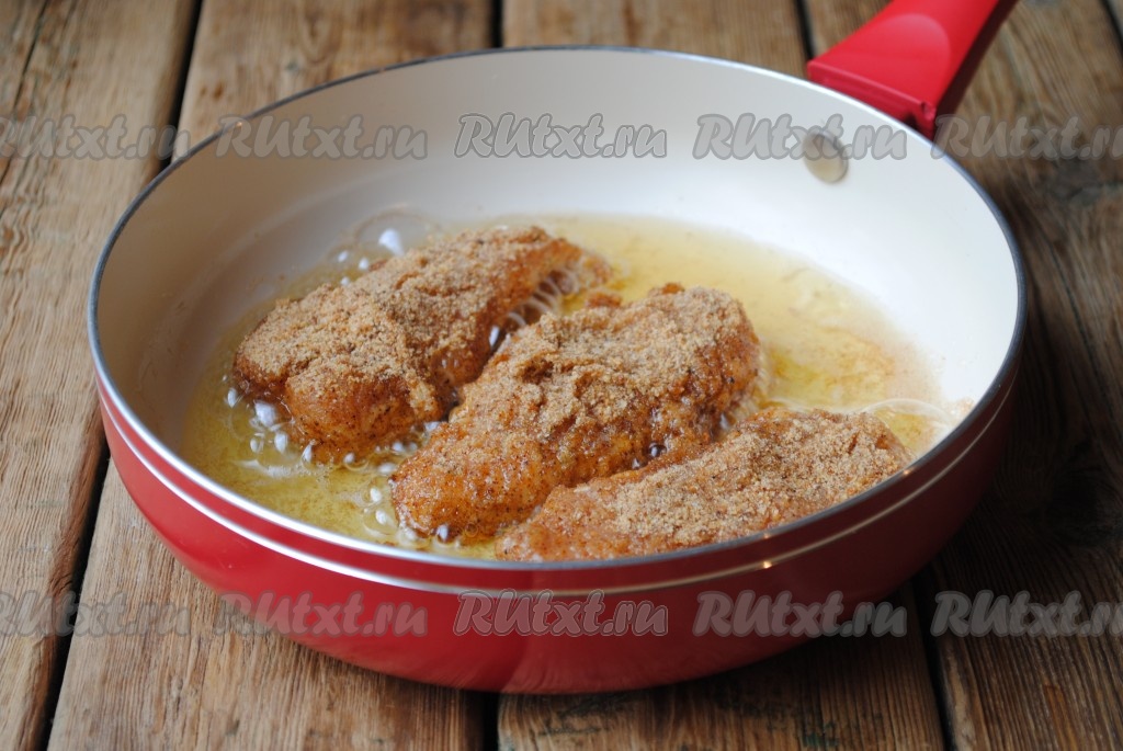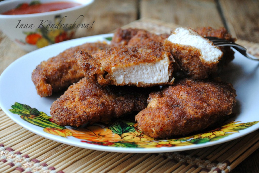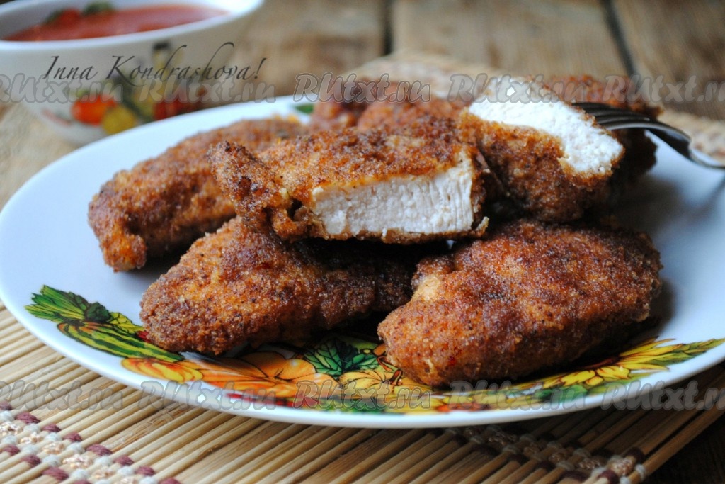 Сочное, вкусное куриное филе, приготовленное в панировочных сухарях на сковороде, особенно хорошо сочетается с домашним кетчупом.