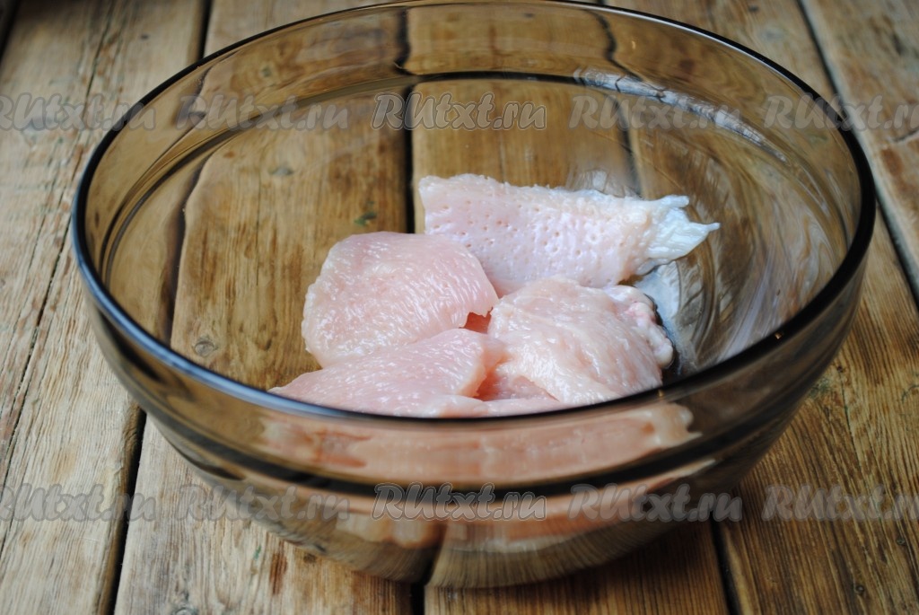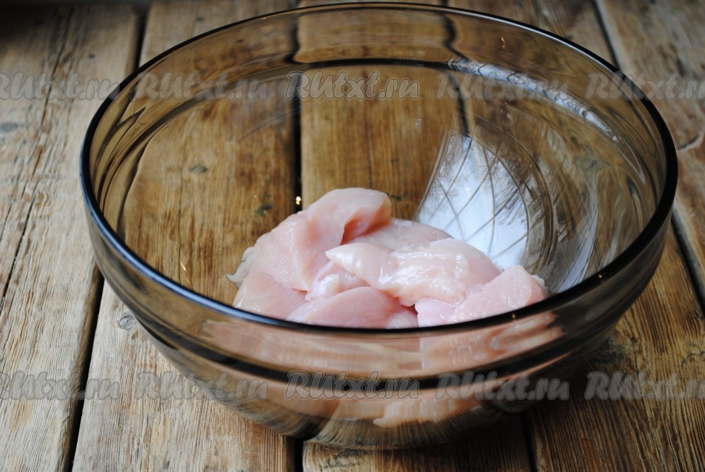 Куриное филе вымыть холодной водой, обсушить и нарезать небольшими кусочками.
